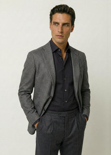 Denne flannel er vævet i et flot mini Houndstooth mønster i sort og grå med et flot meleret spil, og er med de fine uldtråde, vævet til en 270 gr metervarer der giver en let og elegant jakke med en blød drapering.