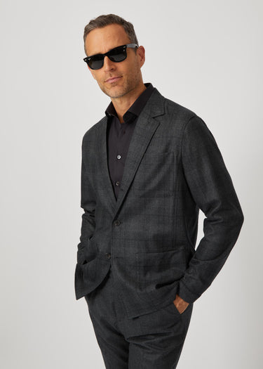 The specially selected flannel is woven in a beautiful deep black and dark gray color in a Prince of Wales pattern with a beautiful melange play, and with the fine wool threads, is woven into a 270 g fabric that provides a light and elegant jacket with a soft drape.