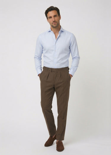 Our Brown Brushed Cotton Twill Trouser is made with sewn pleats and side adjustments, which gives a more casual and sporty look, as well as ensuring comfort and the possibility of adjusting the waist. Our Trousers are carefully sewn in Portugal, by skilled and thorough hands, where many challenging processes are required to achieve these seemingly effortless brown Trousers.