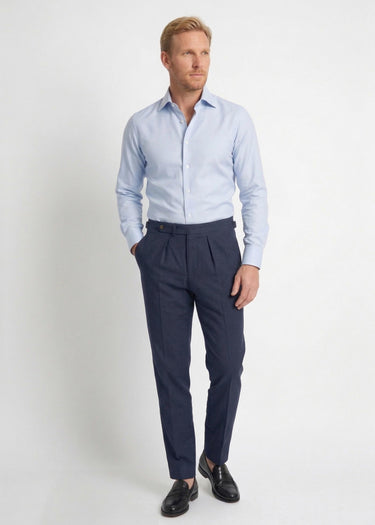 Our Navy Brushed Cotton Twill Trouser is made with sewn pleats and side adjustments, which gives a more casual and sporty look, as well as ensuring comfort and the possibility of adjusting the waist. Our Trousers are carefully sewn in Portugal, by skilled and thorough hands, where many challenging processes are required to achieve these seemingly effortless dark blue Trousers.