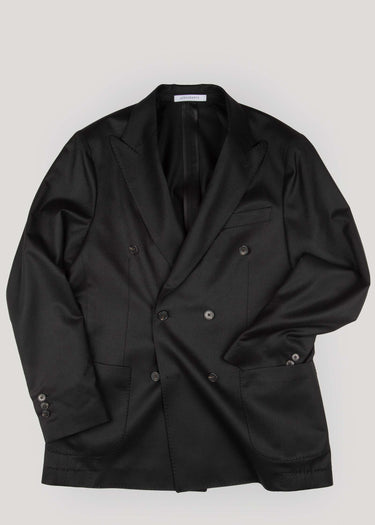 Our black double-breasted blazer is made "unstructured", with no lining in the back and no puffed shoulders, which gives a more casual look and provides better breathability for the back.