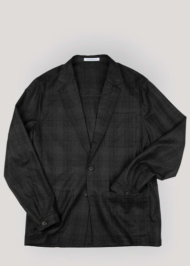 Den særligt udvalgte flannel er vævet i en flot dyb sort og mørkegrå farve i et Prince of Wales mønster med et flot meleret spil, og er med de fine uldtråde, vævet til en 270 gr metervarer der giver en let og elegant jakke med en blød drapering.
