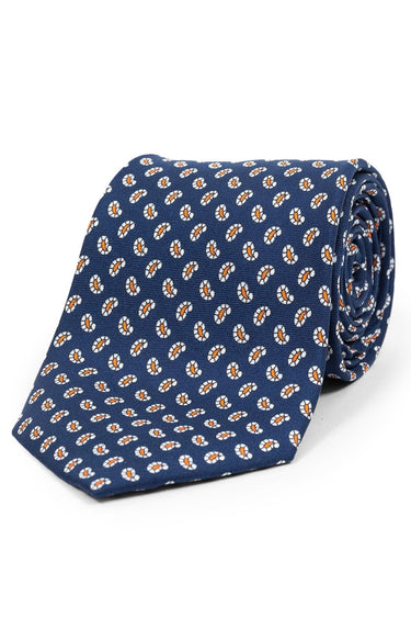 'The Navy Orange Printed Counselor' er lavet i 100% silke i en navy bundfarve, som er sammensat med elegante hvide/orange paisleys. Det vil se cool ud med de fleste jakkesæt, ligesom vi anbefaler at sammensætte slipset med en skarp, hvid skjorte for at skabe et tidløst look.